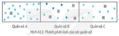 Các kí hiệu trong Hình 43.3 biểu thị các loài sinh vật khác nhau. Trong sơ đồ thành phân loài của ba quần xã sinh vật (A, B, C), quần xã nào có độ đa dạng cao nhất? Tại sao?