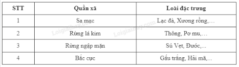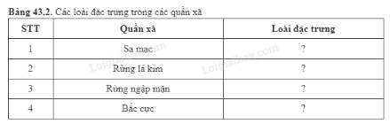 Hãy kể tên một số loài đặc trưng trong các quần xã dưới đây (Bảng 43.2):