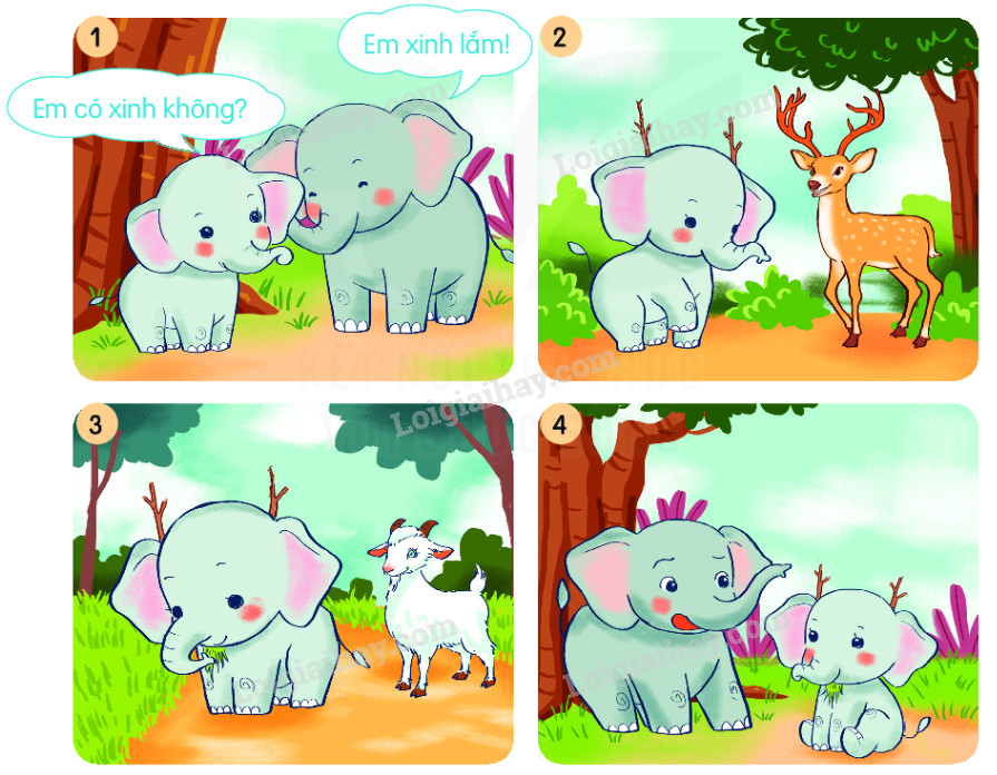 – Sự việc: Voi em hỏi voi anh rằng “Em có xinh không?”. Voi anh trả lời rằng “Em xinh lắm!”