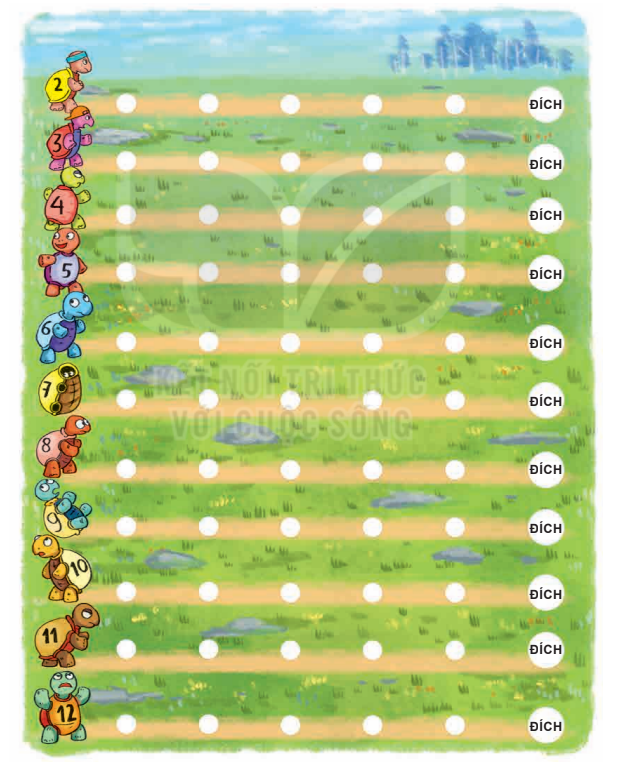 Có 11 chú rùa cùng nhau thi chạy. Mỗi chú rùa được đánh số từ 2 đến 12. Hãy giúp những chú rùa di chuyển bằng cách gieo hai xúc xắc rồi tính tổng số chấm ở các mặt trên của xúc xắc. Kết quả nhận được là số nào thì chú rùa mang áo ghi số đó được tiến thêm 1 ô.
