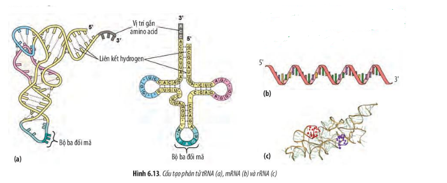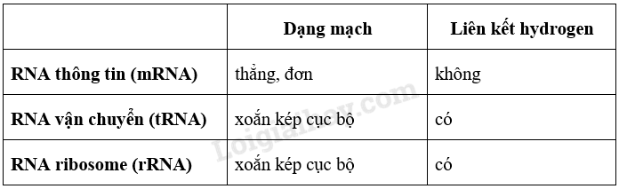 21. Quan sát Hình 6.13, hãy lập bảng phân biệt ba loại RNA dựa vào các tiêu chí sau: dạng mạch (kép hay đơn, xoắn hay thẳng), liên kết hydrogen (có hay không có).