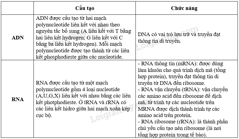 Câu 2: Phân biệt cấu tạo, chức năng của DNA và RNA.