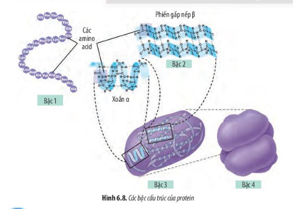 Quan sát hình 6.8 và đưa ra nhận xét về cách liên kết trong các bậc của protein.