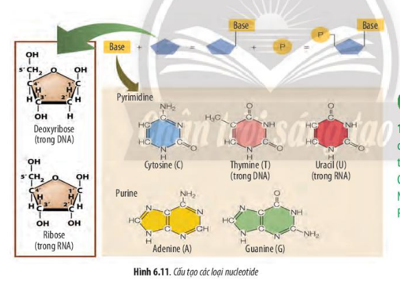 17. Quan sát Hình 6.11, hãy cho biết thành phần và sự hình thành của một nucleotide. Có bao nhiêu loại nucleotide? Nucleotide cấu tạo nên DNA và RNA khác nhau như thế nào?
