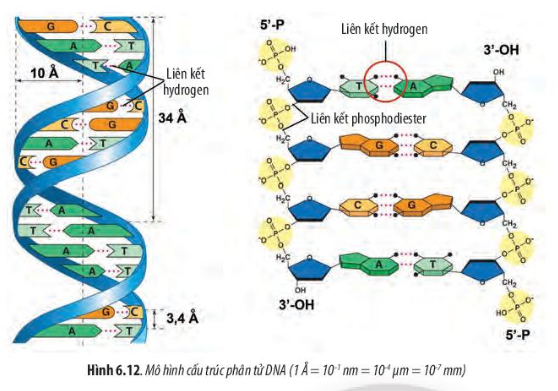 18. Hai mạch polynucleotide liên kết với nhau theo nguyên tắc bổ sung (A liên kết với T bằng hai liên kết hydrogen; G liên kết với C bằng ba liên kết hydrogen). Mỗi mạch polynucleotide được tạo thành từ các liên kết phosphodieste giữa các nucleotide.