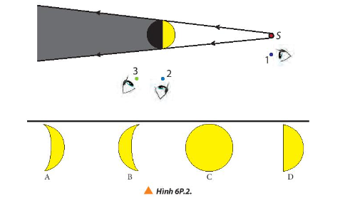Quan sát Hình 6P.1 và cho biết: đâu là hiện tượng nguyệt thực. Giải thích bằng cách vẽ các thiên thể và các tia sáng tương ứng.