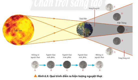 Quan sát Hình 6.9 và mô tả quá trình diễn ra hiện tượng nguyệt thực