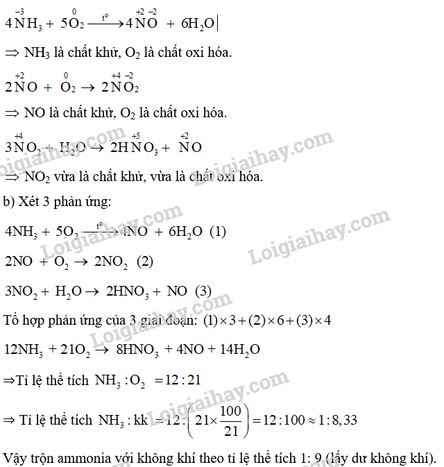 b) Tại sao ban đầu cần trộn ammonia với không khí theo tỉ lệ thể tích 1: 9? (Biết không khí chứa 21% thể tích oxygen.)
