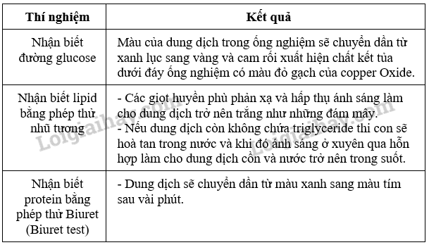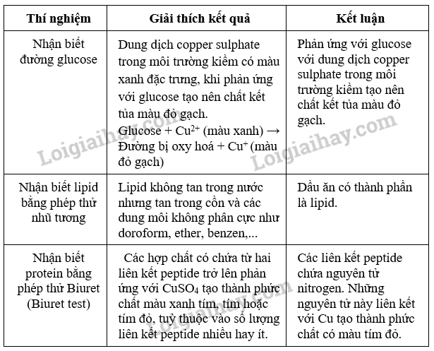 – Áp dụng được nguyên lí của các phản ứng hoá học đặc thù để nhận biết được từng loại phân tử sinh học.