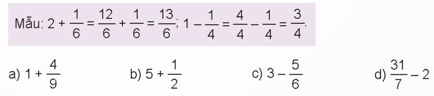 Viết số tự nhiên dưới dạng phân số có mẫu số bằng mẫu số của phân số còn lại rồi thực hiện phép cộng (trừ) trừ hai phân số như thông thường.