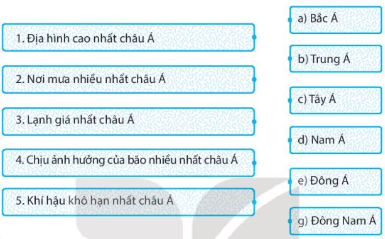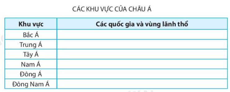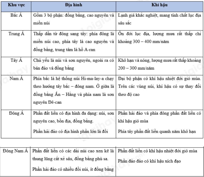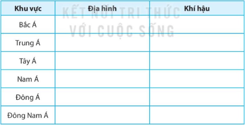 14. Cho biết đặc điểm địa hình, khí hậu của các khu vực ở châu Á bằng cách hoàn thành bảng theo mẫu sau.