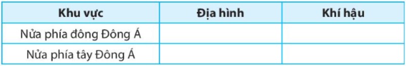10. So sánh sự khác nhau về địa hình và khí hậu ở nửa đông và nửa tây phần đất liền của khu vực Đông Á bằng cách hoàn thành bảng theo mẫu sau.