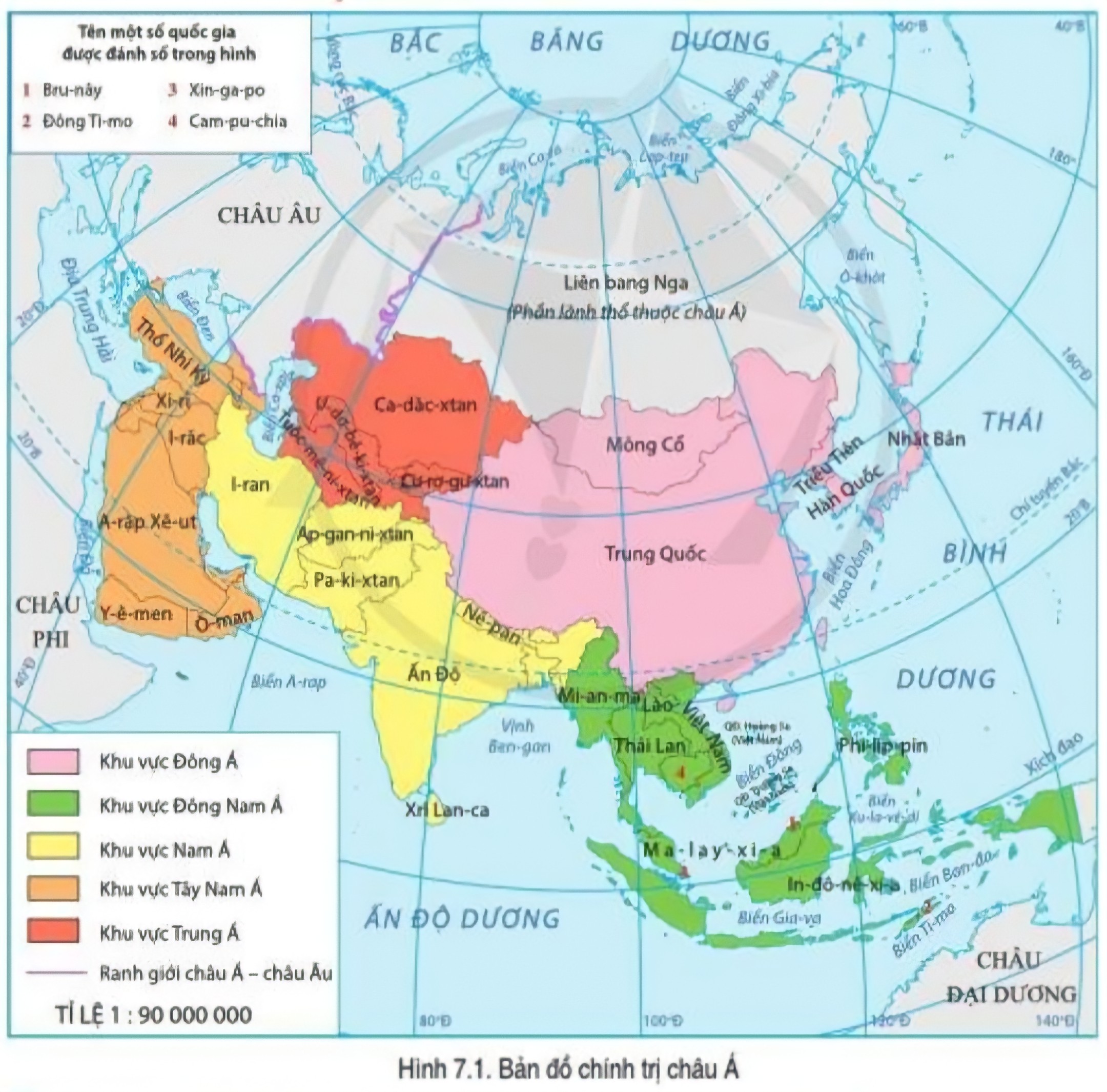 Quan sát hình 7.1, đọc bảng chú giải để biết được màu nền thể hiện các khu vực của châu Á và xác định các khu vực trên bản đồ.