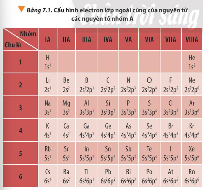 1. Quan sát Bảng 7.1, hãy nhận xét về số electron lớp ngoài cùng của nguyên tử các nguyên tố nhóm A trong cùng một chu kì và trong cùng một nhóm