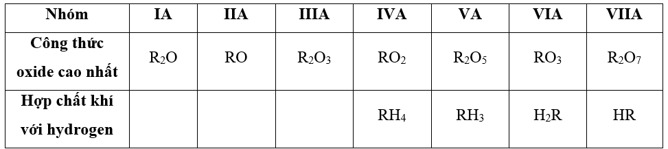 – Công thức oxide cao nhất và hợp chất khí với hydrogen của các nguyên tố từ IA đến VIIA