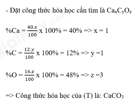 Thạch nhũ trong hang động có thành phần chính là hợp chất (T). Phân tử (T) có cấu tạo từ nguyên tố calcium, carbon và oxygen với các tỉ lệ phần trăm tương ứng là 40%, 12% và 48%. Khối lượng phân tử (T) là 100 amu. Hãy xác định công thức hóa học của T