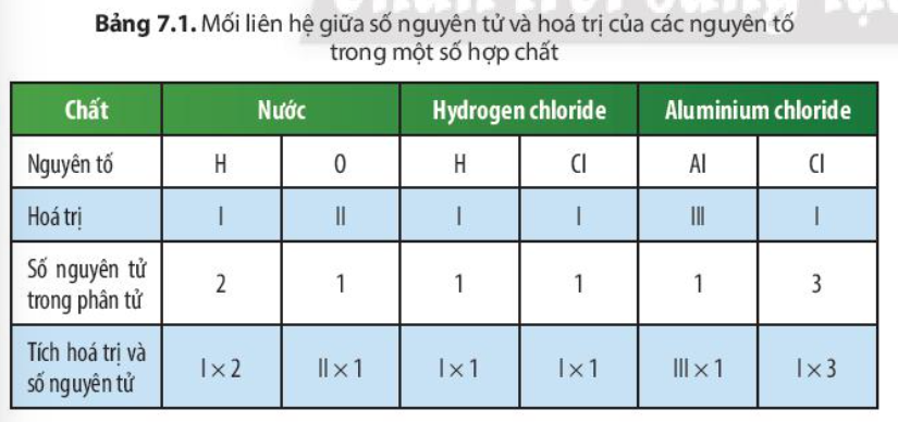 Em hãy so sánh về tích của hóa trị và số nguyên tử của 2 nguyên tố trong phân tử mỗi hợp chất ở Bảng 7.1