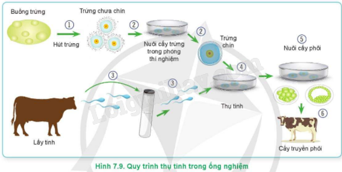 Hãy quan sát hình 7.9 và nêu thứ tự đúng của các bước trong quy trình thụ tinh trong ống nghiệm cho vật nuôi ở Bảng 7.1