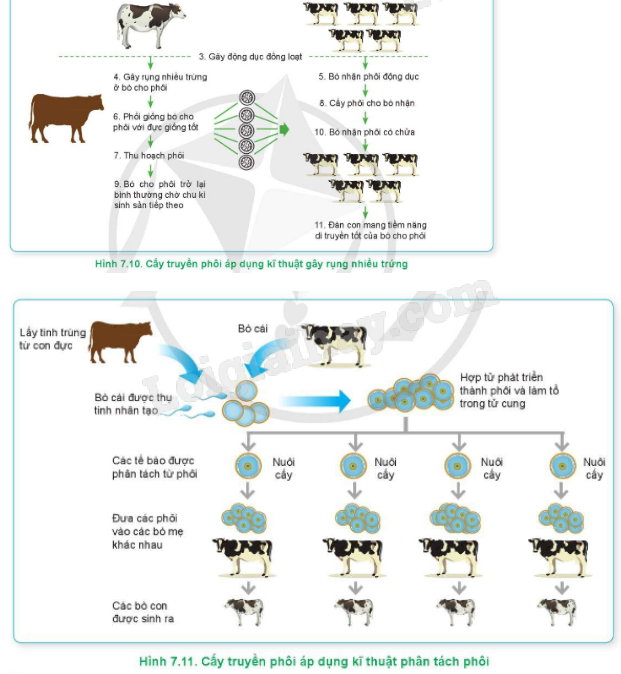 Quan sát hình 7.10, hình 7.11 và nêu các bước trong quy trình cấy truyền phôi.