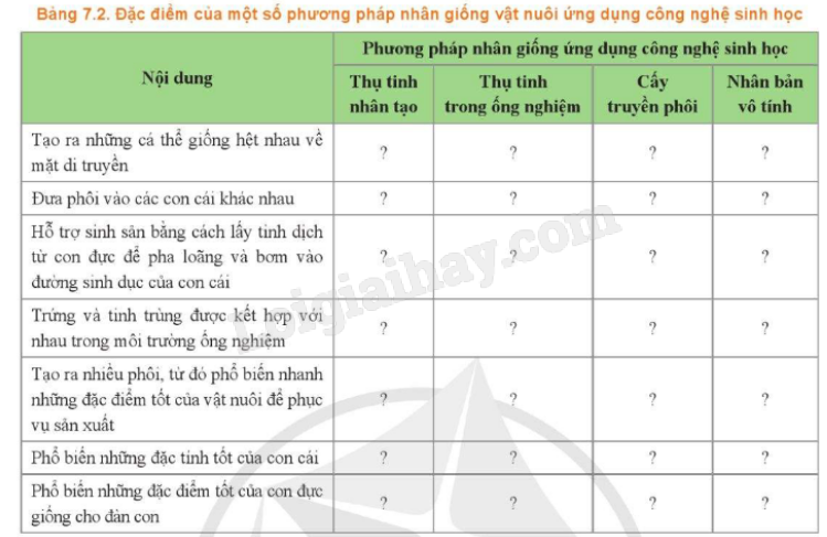 Hãy lựa chọn các nội dung phù hợp với những ứng dụng công nghệ sinh học trong nhân giống ở Bảng 7.2.
