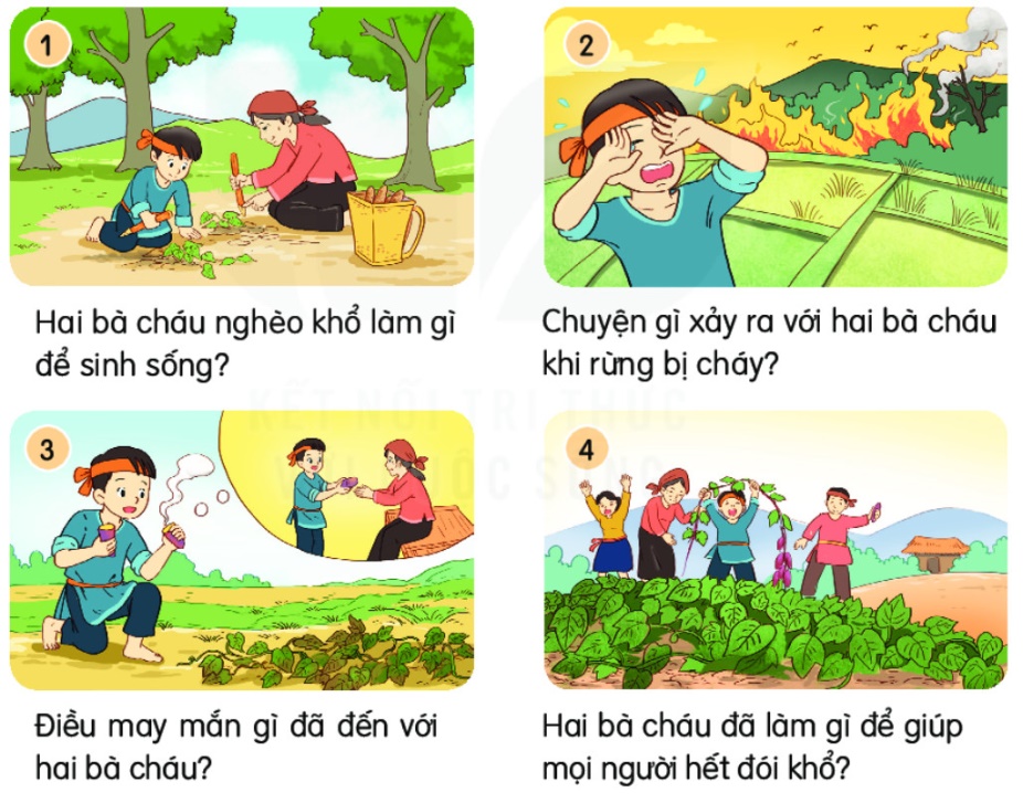 (4) Cậu bé làm theo lời bà dặn. Chỉ mấy tháng sau, loài cây lạ mọc khắp nơi, rễ cây phình to ra thành củ có màu tím đỏ. Từ đó, nhà nhà hết đói khổ. Mọi người gọi cây đó là “khoai lang”. Đến bây giờ, khoai lang vẫn được nhiều người ưa thích.