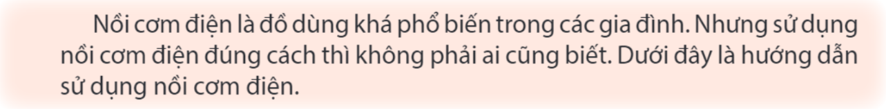 Đọc văn bản hướng dẫn sử dụng nồi cơm điện và trả lời câu hỏi. Văn bản trên hướng dẫn sử dụng sản phẩm gì. Trong mỗi bước, sản phẩm đó được sử dụng như thế nào. Trao đổi về cách viết hướng dẫn sử dụng một sản phẩm. Chia sẻ với người thân về cách sử dụng nồi cơm điện hoặc một số đồ gia dụng khác.