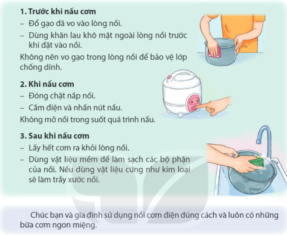 b. Việc sử dụng nồi cơm điện chia làm 3 bước.