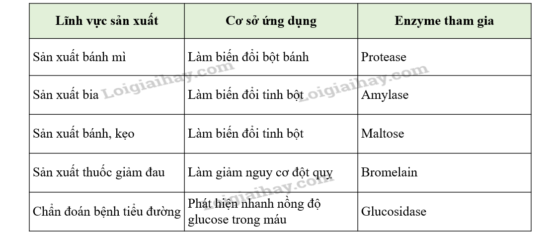 1. Hãy liên hệ những lĩnh vực sản xuất và đời sống có ứng dụng các loại enzyme bằng cách hoàn thành vào bảng theo mẫu sau: