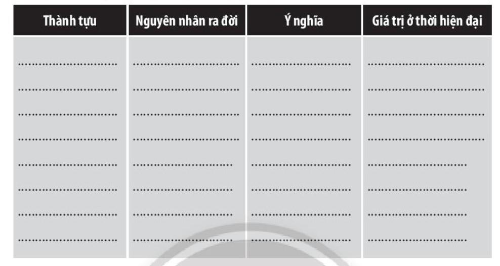 Câu 5. Hoàn thành bảng thống kê về một thành tựu của văn minh Trung Hoa còn ý nghĩa giá trị đến ngày nay mà em thích nhất. Giải thích vì sao?