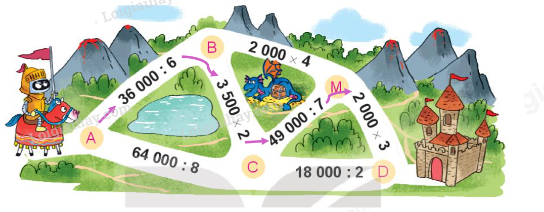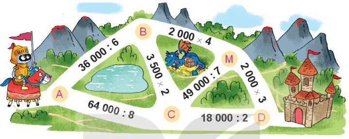 Thực hiện tính nhẩm các phép tính xuất hiện trên đường đi, đường đến tòa lâu đài là các đoạn đường ghi phép tính có kết quả bé hơn 8 000.