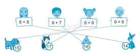 Viết vào chỗ chấm. Tính nhẩm. 8 + 7 = …. 8 + 3 = ….. 8 + 5 = ….. 8 + 6 = ….. 8 + 8 = ….. 8 + 9 = ….. Nối mỗi bảng với các con vật các bạn nuôi.
