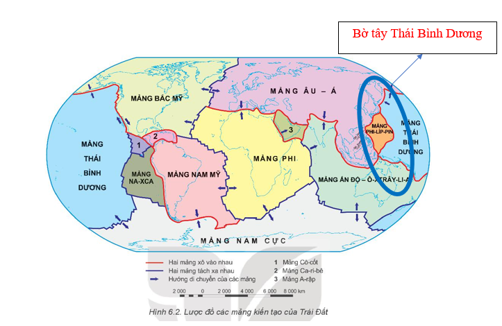 Dựa vào hình 8 và hình 6.2 SGK, cho biết ở bờ Tây Thái Bình Dương, vành đai động đất, núi lửa hình thành do sự tiếp xúc của mảng kiến tạo nào?