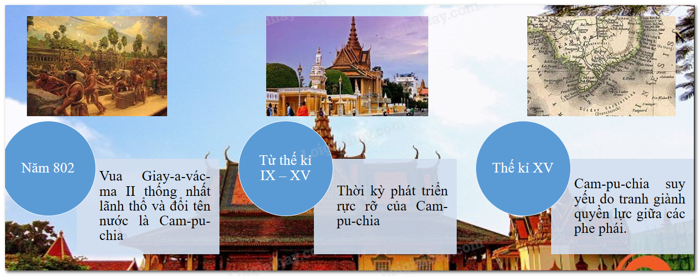 Hãy vẽ trục thời gian thể hiện những nét chính về quá trình hình thành, phát triển của Vương quốc Campuchia.