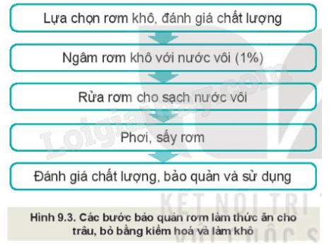 Quan sát Hình 9.3 và mô tả các bước bảo quản thức ăn (rơm) cho trâu, bò bằng phương pháp kiềm hóa và làm khô.