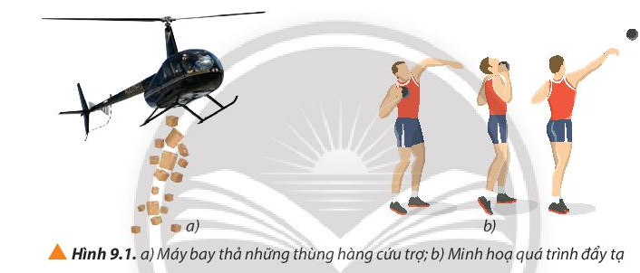 Chuyển động ném là một chuyển động thường gặp trong cuộc sống như: máy bay trực thăng thr những thùng hàng cứu trợ (Hình 9.1a), vận động viên đẩy tạ (Hình 9.1b). Trong cả hai trường hợp, vật đều được ném từ một độ cao h so với mặt đất và có vận tốc đầu \(\overrightarrow {{v_0}} \) hợp với phương ngang một góc α ( 0 ≤ α ≤ 900 ). Để thùng hàng rơi trúng vị trí cần thiết, quả tạ bay đi được quãng đường xa nhất, cần phải có những điều kiện gì?