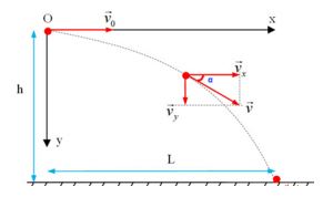 + Tầm ném xa của vật ném ngang: \(L = {v_0}t = {v_0}.\sqrt {\dfrac{{2h}}{g}} \)
