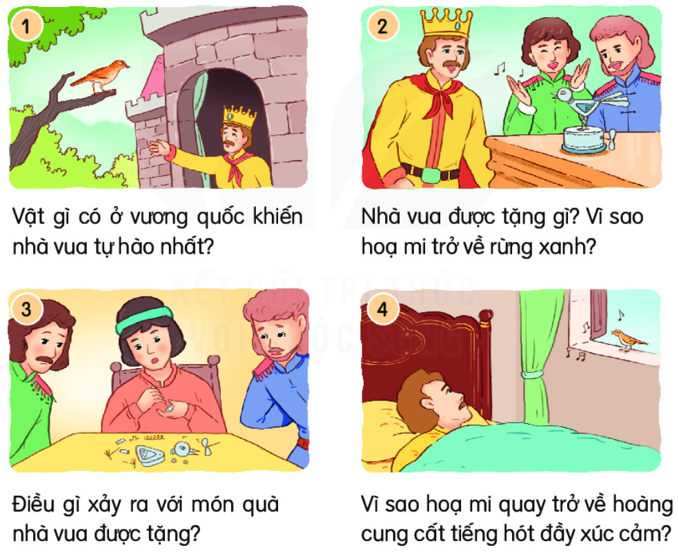 (4) Vài năm sau, nhà vua lâm bệnh, khó qua khỏi. Một hôm, nhà vua bỗng thấy có bóng hoạ mi ở khung cửa sổ lâu đài. Con chim bé nhỏ nghe tin nhà vua ốm nặng đã bay về… Tiếng hoạ mi hót đầy xúc cảm khiến nhà vua tỉnh lại: