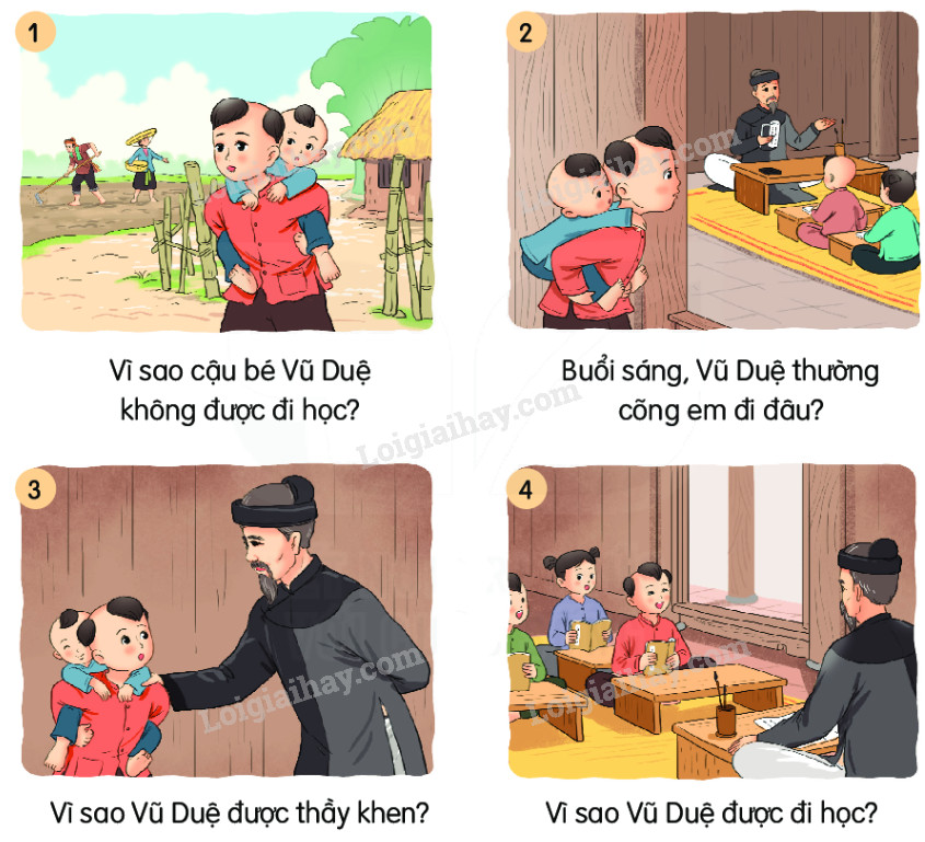 (2) Thuở nhỏ, vì nhà nghèo, Vũ Duệ không được đi học, phải ở nhà trông em, lo cơm nước cho bố mẹ đi làm ngoài đồng. Ngày nào cũng vậy, mỗi buổi sáng, khi thầy đồ trong làng bắt đầu dạy học, Vũ Duệ lại cõng em đứng ở ngoài hiên, chăm chú nghe thầy giảng bài.
