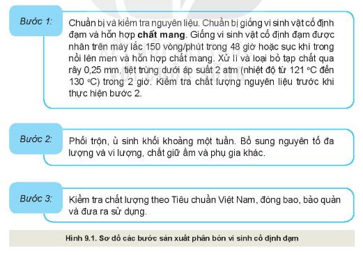 Bước 1: Chuẩn bị và kiểm tra nguyên liệu. Chuẩn bị giống vi sinh vật cố định đạm được nhân trên máy lắc 150 vòng/ phút trong vòng 48 giờ hoặc sục khí trong nồi lên men và hỗn hợp chất mang. Xử lí và loại bỏ tạp chất qua rây 0,25 mm, tiệt trùng dưới áp suất 2atm (nhiệt độ từ 121⁰C đến 130⁰C) trong 2 giờ. Kiểm tra chất lượng nguyên liệu trước khi thực hiện bước 2.