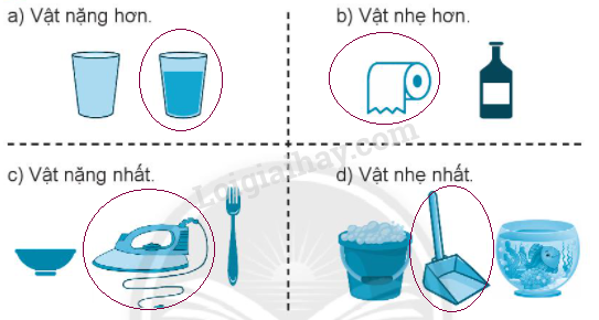Quan sát tranh, em so sánh cân nặng của các vật và khoanh vào vật nặng hơn, nhẹ hơn, vật nặng nhất và vật nhẹ nhất cho thích hợp.