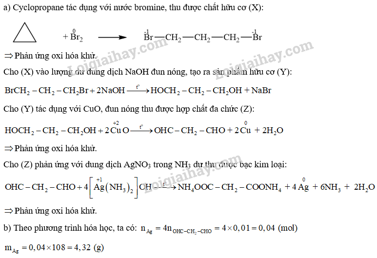 Cho cyclopropane tác dụng với nước bromine, thu được chất hữu cơ (X). Cho (X) vào lượng dư dung dịch NaOH đun nóng, tạo ra sản phẩm hữu cơ (Y). Cho (Y) tác dụng với CuO, đun nóng thu được hợp chất đa chức (Z). Cho 0,01 mol (Z) phản ứng với dung dịch AgNO3 trong NH3 thu được bạc kim loại.