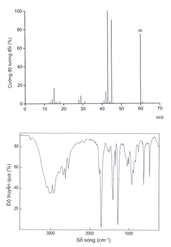 Dựa vào peak [M+] có giá trị m/z lớn nhất của (E) \[ \Rightarrow \] M(E) = 60.