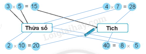 Từ đó em nối các số là thừa số hoặc tích cho thích hợp.