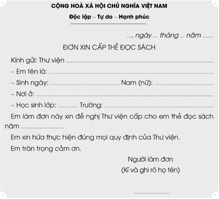 Viết thông tin phù hợp vào chỗ trống để hoàn thành Đơn xin cấp thẻ đọc sách ở thư viện trường (hoặc thư viện nơi em sinh sống):