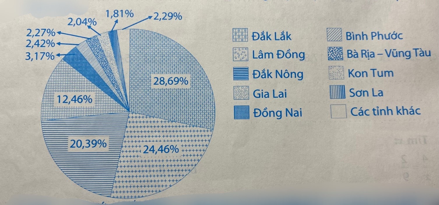 Việt Nam là nước xuất khẩu cà phê lớn thứ hai thế giới. Em hãy cho biết 4 tỉnh nào ở Việt Nam có diện tích trồng cà phê lớn nhất, mỗi tỉnh chiếm bao nhiêu phần trăm diện tích cà phê cả nước?