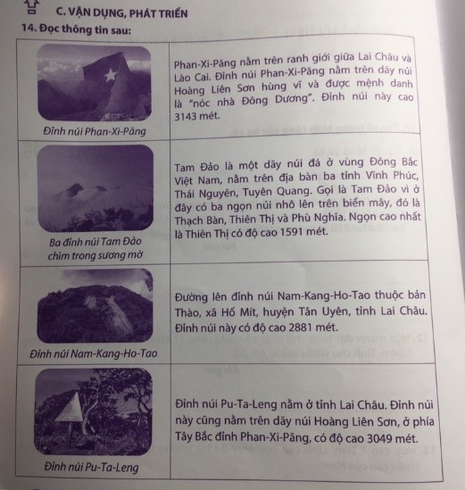 a) Đọc đoạn thông tin trên và tìm tên các đỉnh núi.
