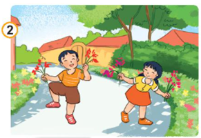 Hai bạn nhỏ đang ngắt hoa bên đường. Đây là việc không nên làm vì sẽ làm mất mĩ quan của làng quê, không phải là việc làm thể hiện tình yêu quê hương.