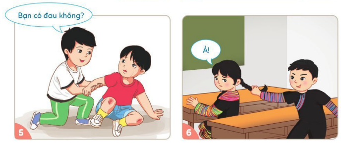 Bạn nam đang đỡ bạn dậy khi bạn bị ngã và hỏi thăm “Bạn có đau không”. Đây là việc làm đúng vì bạn nam đã biết quan tâm, giúp đỡ bạn bè. Em đồng tình với việc làm trên.