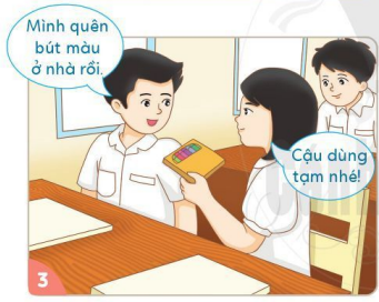 Bạn nữ đã cho bạn nam ngồi cùng bạn mượn bút màu khi nạn nam để quên ở nhà. Đây là việc làm đúng, thể hiện sự giúp đỡ bạn bè. Em đồng tình với việc làm của bạn nữ.