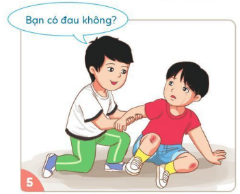 Bạn nam đang đỡ bạn dậy khi bạn bị ngã và hỏi thăm “Bạn có đau không”. Đây là việc làm đúng vì bạn nam đã biết quan tâm, giúp đỡ bạn bè. Em đồng tình với việc làm trên.
